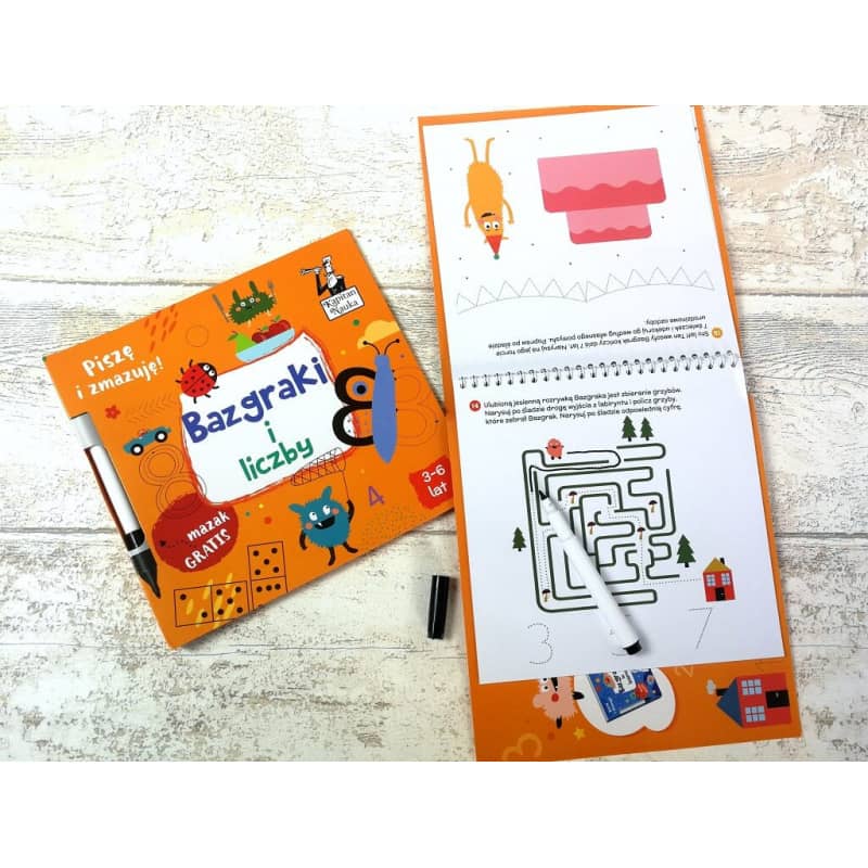 Pakiet zawiera trzy książeczki z zadaniami oraz suchościeralny marker, dzięki czemu zabawa nigdy się nie kończy.