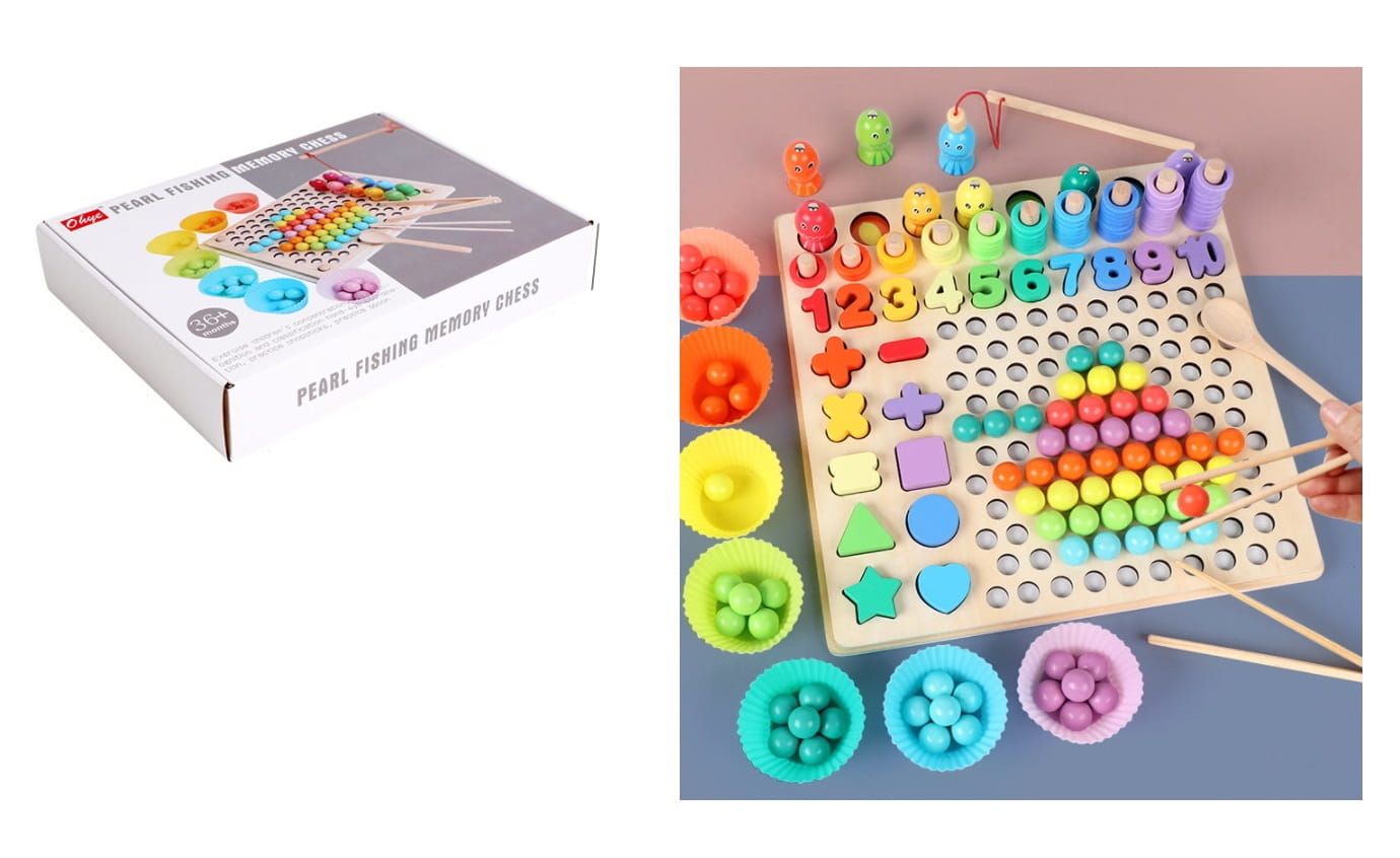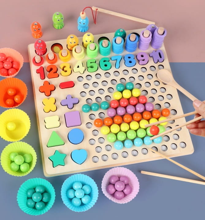 - elementy drewniane: kształty, znaki matematyczne, okręgi, rybki z magnesem