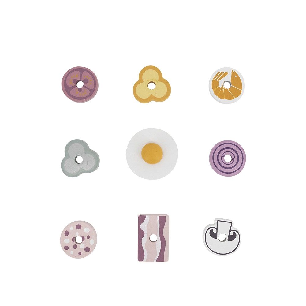 Kompletny zestaw akcesoriów: w komplecie znajdziesz wszystko, co niezbędne do profesjonalnej zabawy. Kuchenka posiada uchwyt, który po ustawieniu tworzy półkę na przybory (łyżka, nóż, łopatka, szczypczyki), garnek, patelnię oraz zestaw drewnianych "składników" (np. jajko sadzone, bekon, grzyb), które można "kroić".