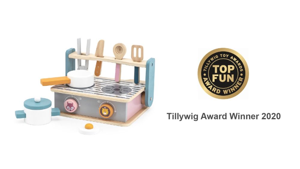 Wsparcie małej motoryki: operowanie małymi akcesoriami, takimi jak drewniane sztućce, "krojenie" dołączonych składników czy obracanie pokręteł, to świetne ćwiczenie dla dłoni i paluszków. Kuchenka jest wyposażona w dwa obrotowe pokrętła z uroczymi wizerunkami lisa i lwa, które dodatkowo angażują zmysły.