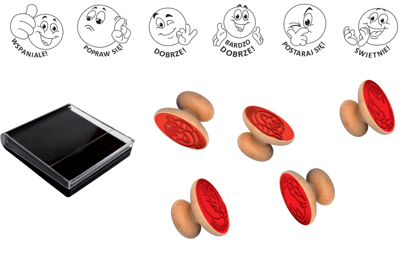 Pieczątki do oceny i motywowania zapakowane są w estetycznym kartonowym pudełku o wymiarach: 22 x 19,5 x 5,5 cm.