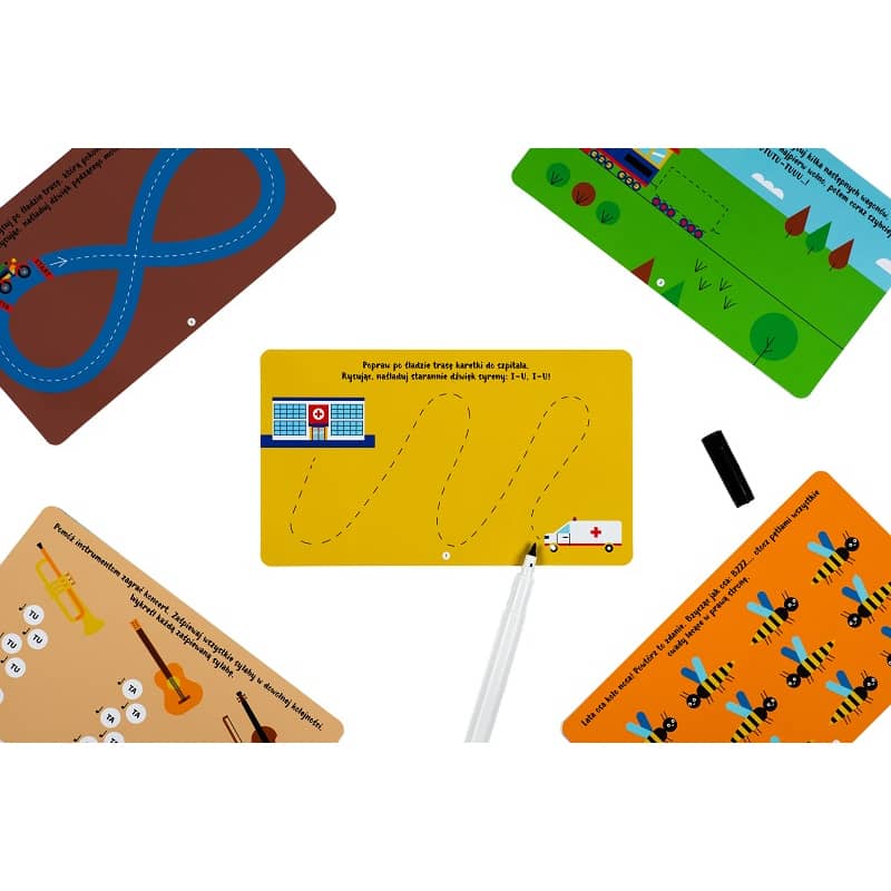 W zestawie: 30 dwustronnych kart z możliwością ścierania i ponownego zapisywania, pisak suchościeralny, książka poradnik.