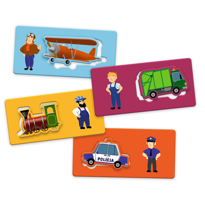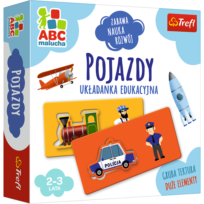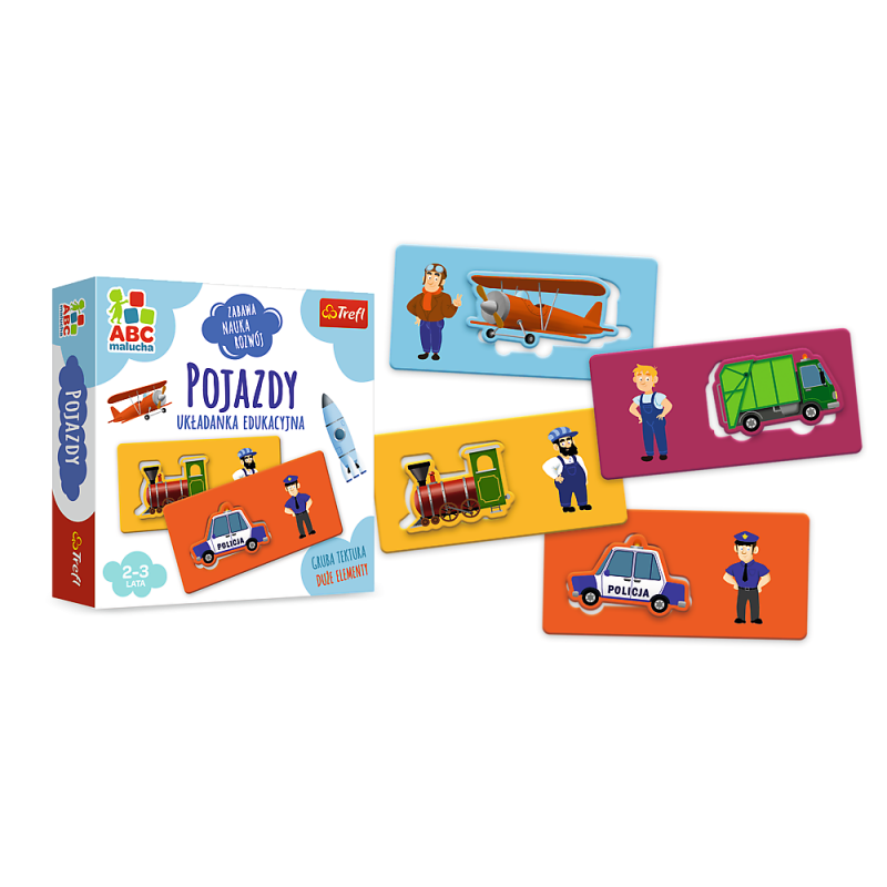 W zestawie gry ABC Malucha Pojazdy Trefl znajduje się: