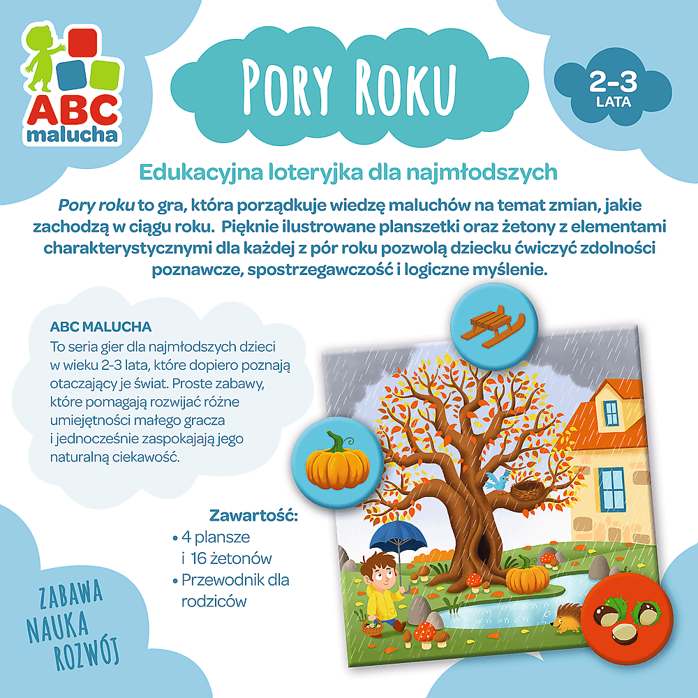 Gra układanka ABC Malucha Pory roku Trefl to kilka wariantów zabawy. W przewodniku znajdziemy propozycję: loteryjka (2 warianty), historyjki, zgadywanki, sylabinki. W ofercie sklepu wartościowe zabawki edukacyjne dla dzieci w różnym wieku.