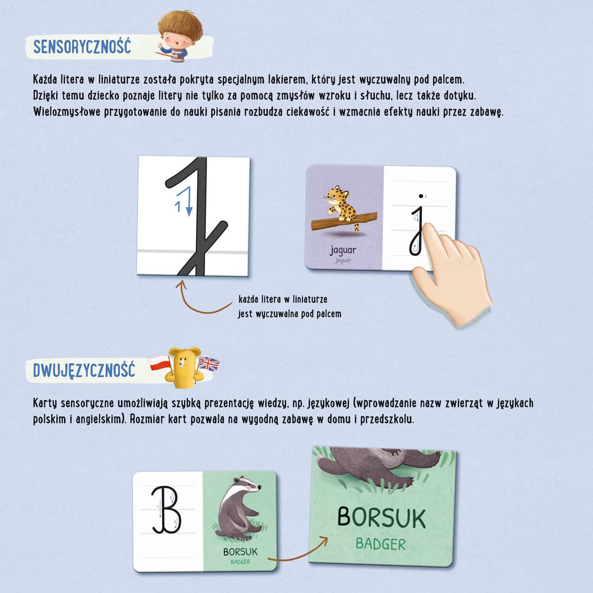 Wsparcie nauki alfabetu w formie pisanej dużych i małych liter w dwóch językach: polskim i angielskim.