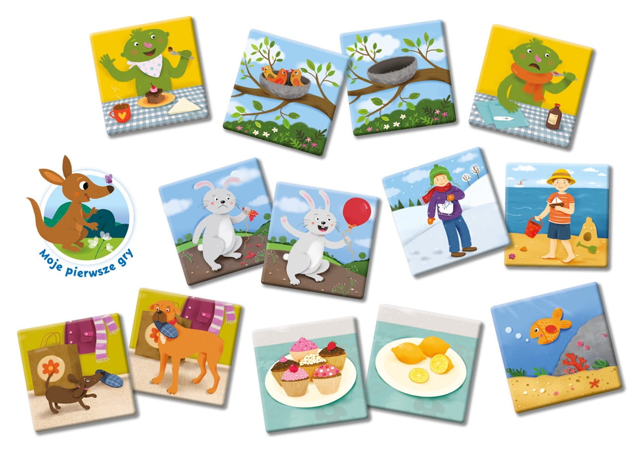 W zestawie produktu 24 zilustrowane kartonowe plakietki.