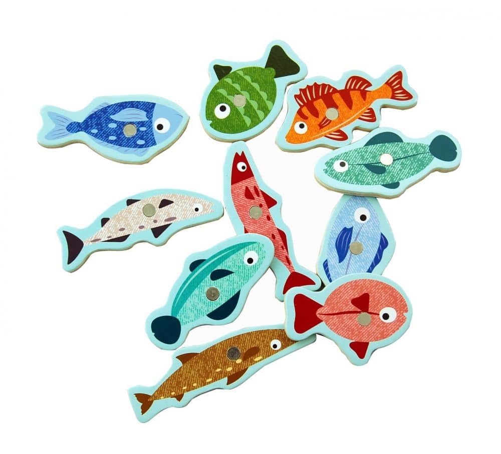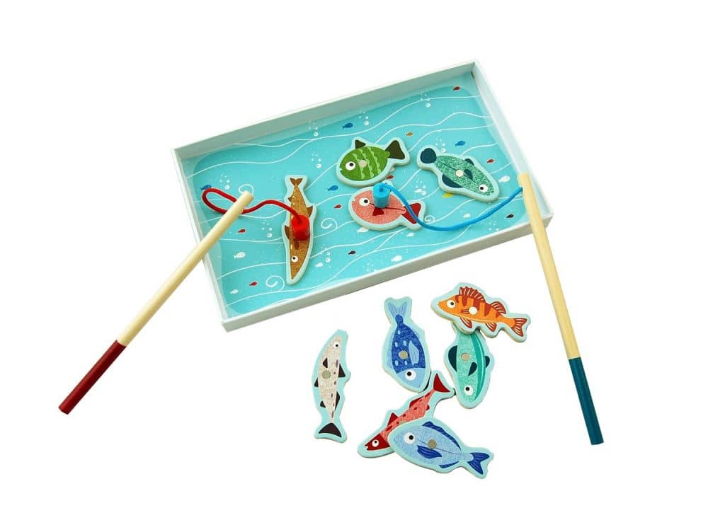 Zabawa polega na łowieniu za pomocą wędki z końcówką magnetyczną drewnianych rybek.