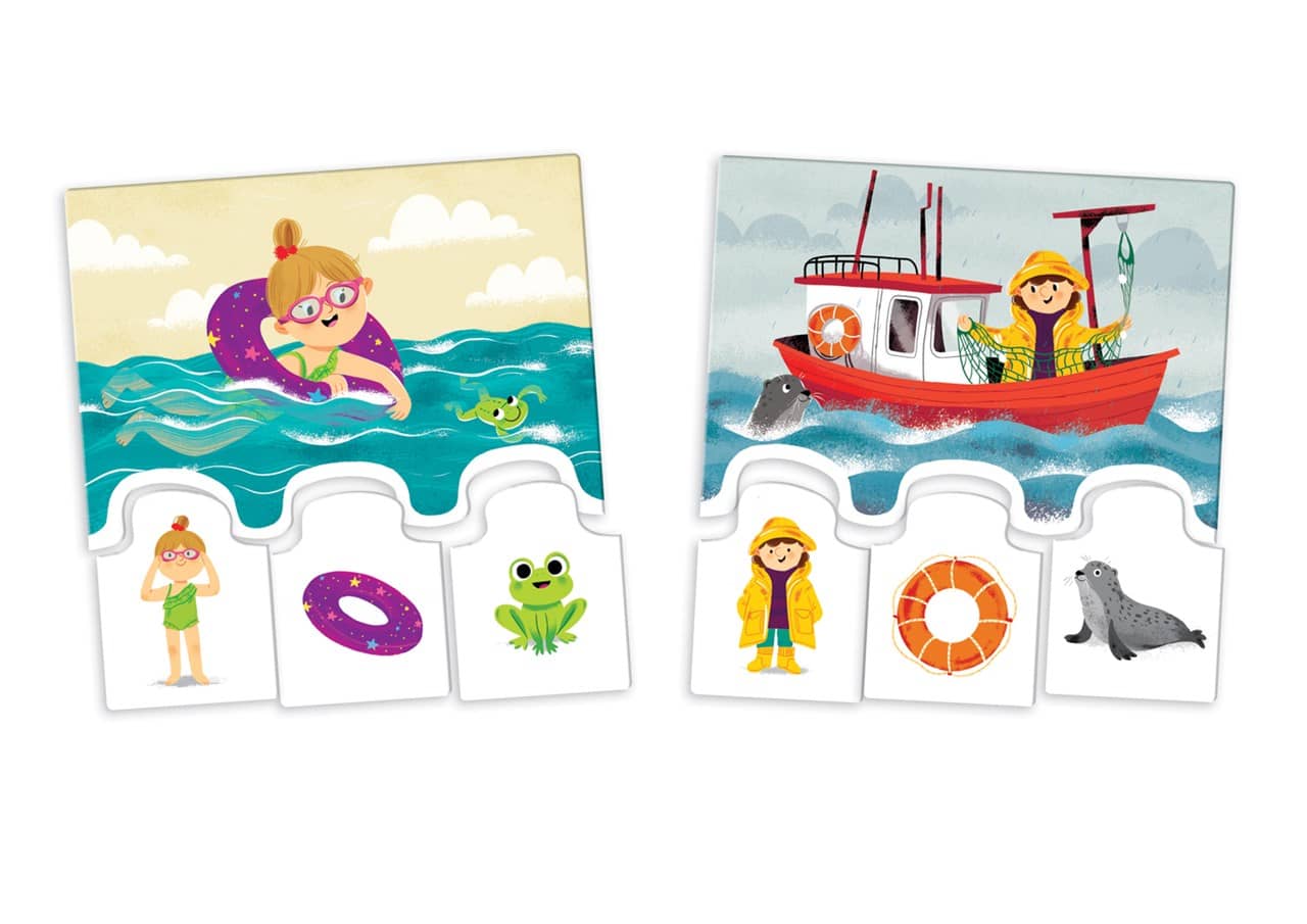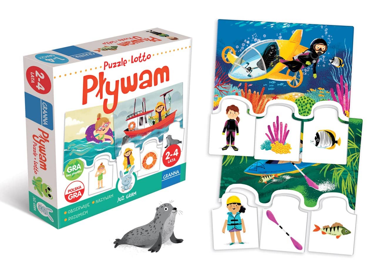 Gra Pływam Granna zawiera 6 kompletów układanek oraz instrukcję.