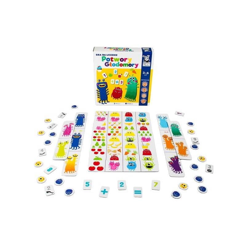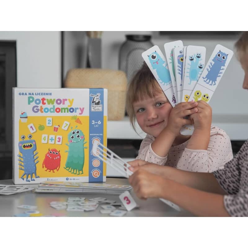 Gra dla dzieci do nauki liczenia Potwory głodomory to ciekawa propozycja polskiego wydawcy z serii Kapitan Nauka, którego produkty cieszą się renomą, trwałym wykonaniem i dobrym odbiorem u dzieci. W ofercie również inne gry edukacyjne i planszowe z oferty tego wydawnictwa.