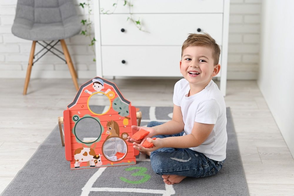 Oto wyzwanie dla małych mistrzów precyzji! Ta drewniana tarcza to brama do szybkich, emocjonujących zawodów w rzucaniu woreczkami.