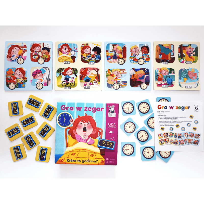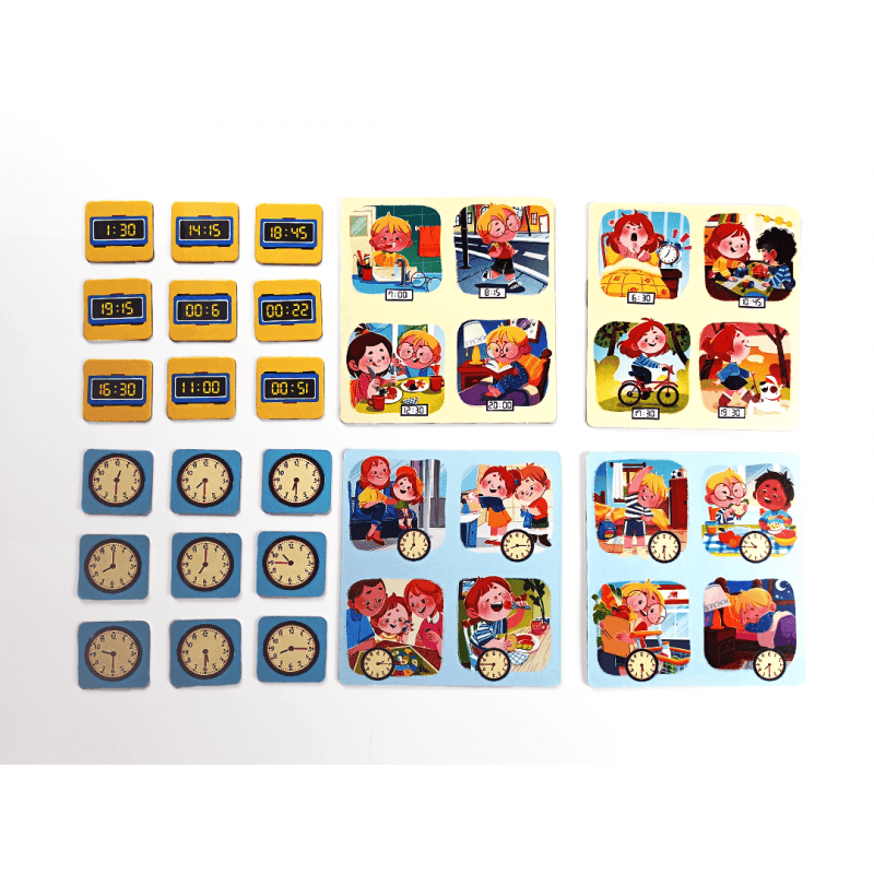 W zestawie znajdują się tabliczki z kolorowymi ilustracjami, które przedstawiają sytuacje codziennego życia, tarcze zegarowe i godziny.