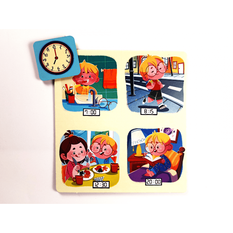 Podczas zabawy dzieci mogą dopasowywać godziny do sytuacji i tarczy zegarowej, opowiadać o tym co dzieje się na obrazku, a nawet tworzyć własne historyjki.