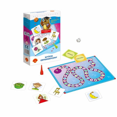 Gra Wyścig ortograficzny mini to połączenie znakomitej zabawy z nauką poprawnej pisowni i ortografii. Gracze rzucają kostką i losują o ile pól należy przesunąć pionek na planszy. Zadaniem graczy jest jak najszybsze odszukanie tabliczki z obrazkiem, w którego nazwie występuje litera z pola, na którym stoi pionek. To doskonały sposób na naukę i ćwiczenie tego trudnego zagadnienia jakim jest ortografia.