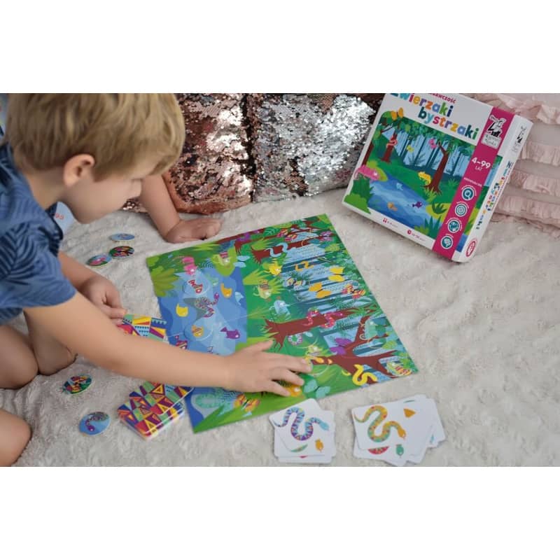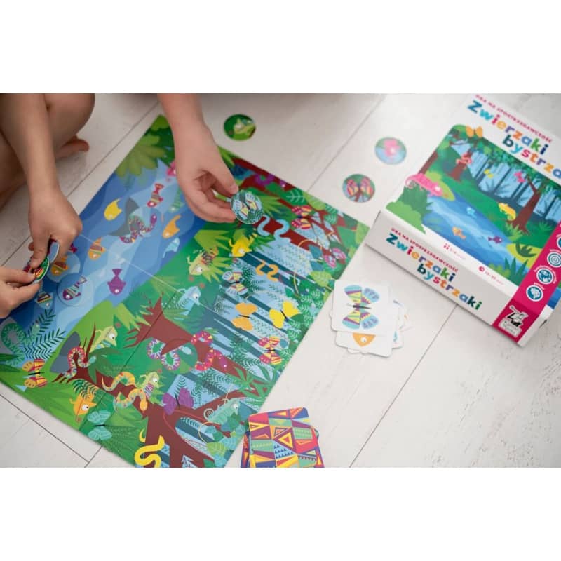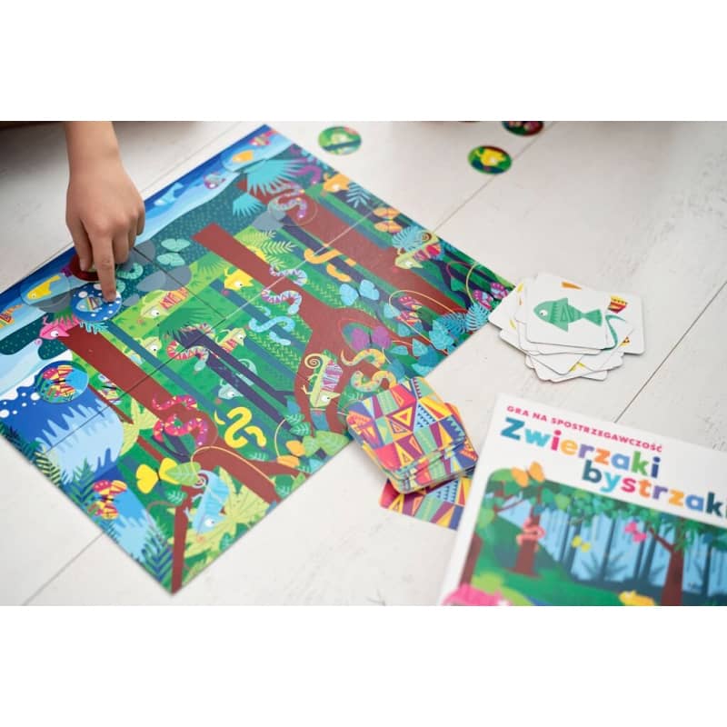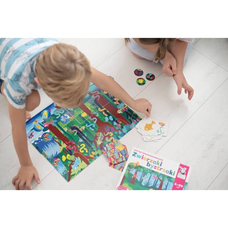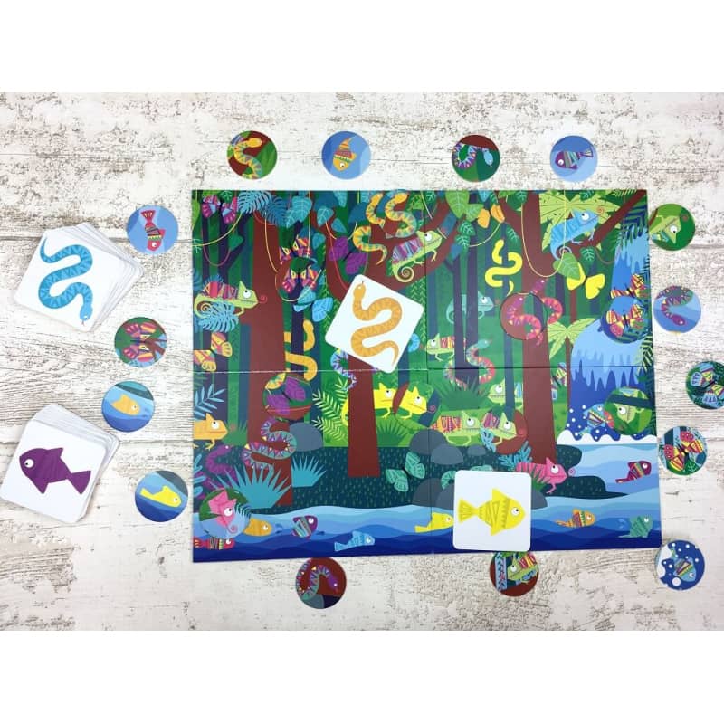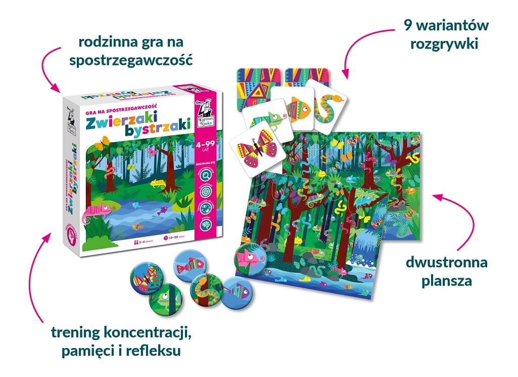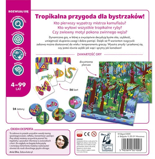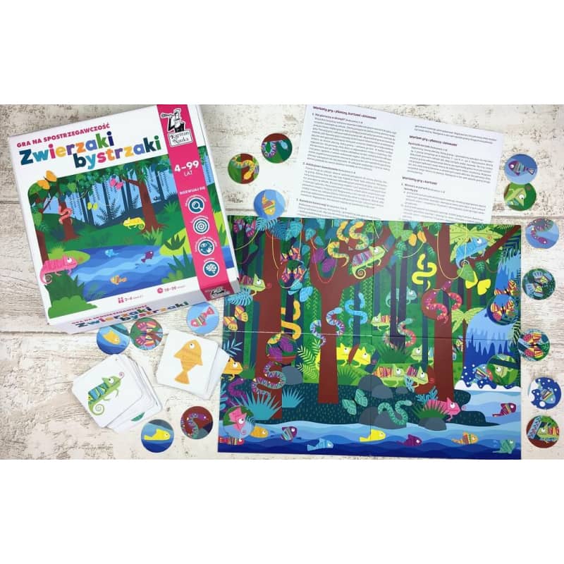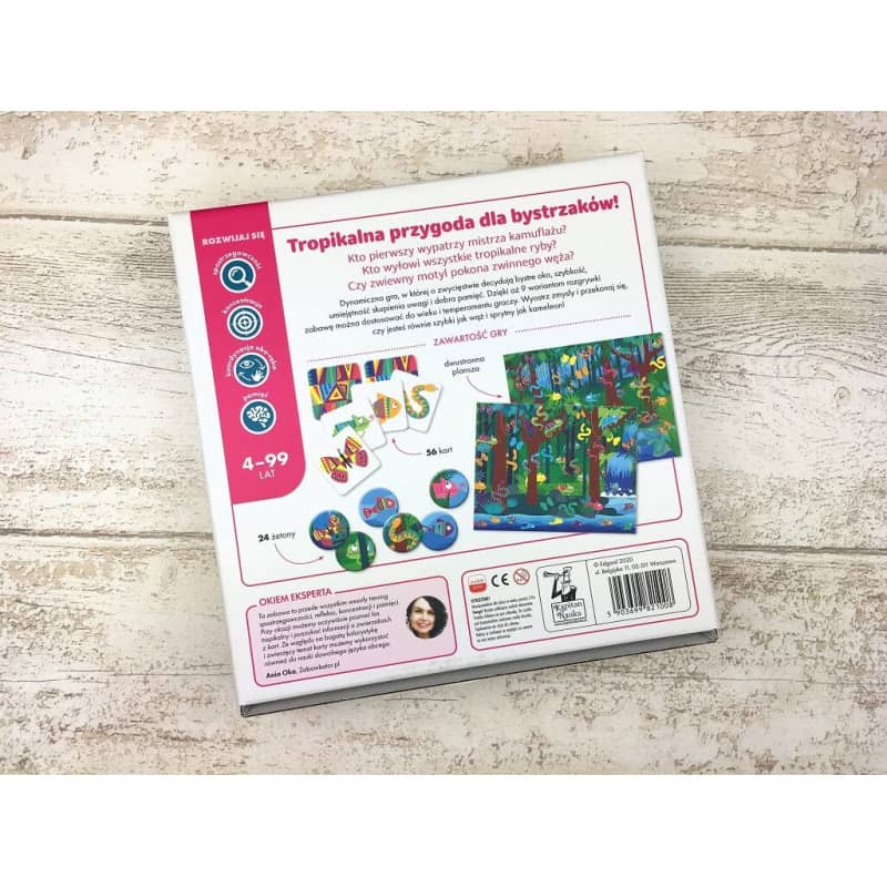 Super propozycja dla całej rodziny, która rozwija spostrzegawczość, pamięć, koncentrację i refleks. Zabawa trwa w przestrzeni tropikalnej dżungli i różnych gatunków kolorowych zwierząt. Rozgrywka przeznaczona jest dla 2-4 osób w wieku 4+.