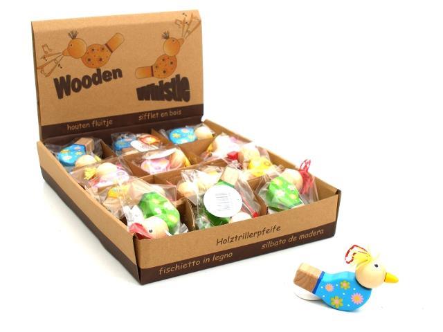 Wykonany z drewna gwizdek logopedyczny Kaczuszka podczas zabawy usprawnia aparat mowy.