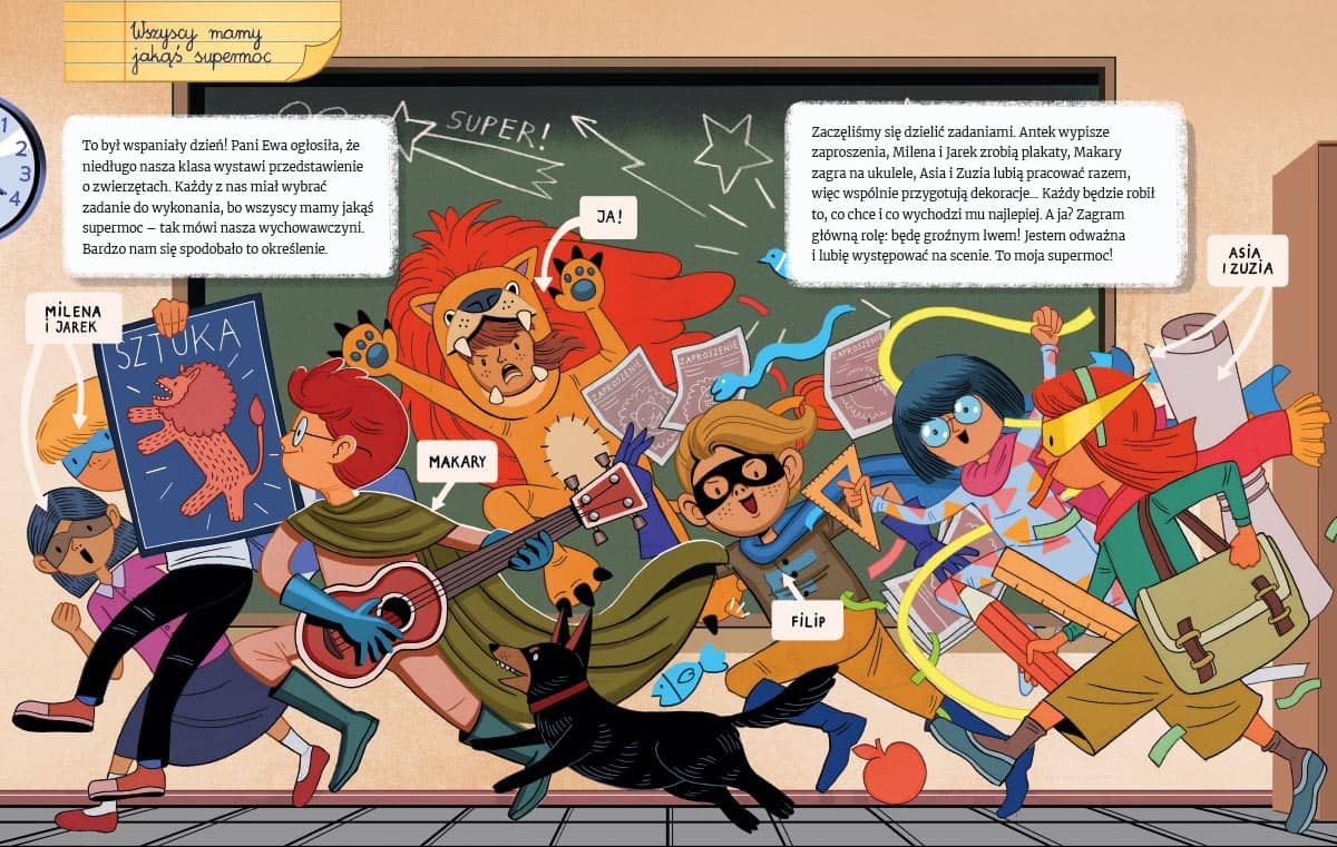 W książce przedstawiono pożądane zachowania i postawy w różnych szkolnych sytuacjach.