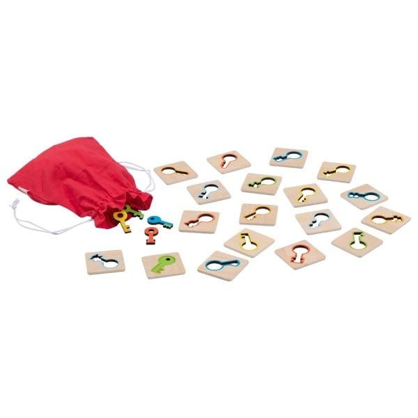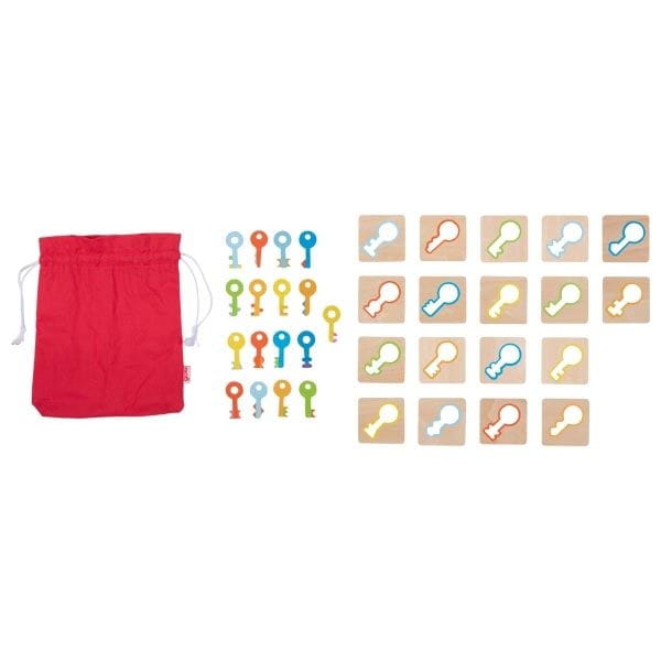 Gra Memo z kluczami przeznaczona jest dla dzieci w wieku 3+. Elementy gry wykonane z drewna, rozmiar płytki ok. 5 x 5 cm.