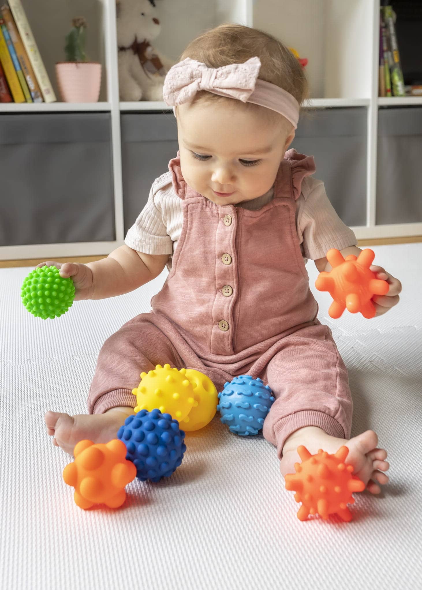 Zestaw 8 miękkich piłeczek do masażu i zabawy.