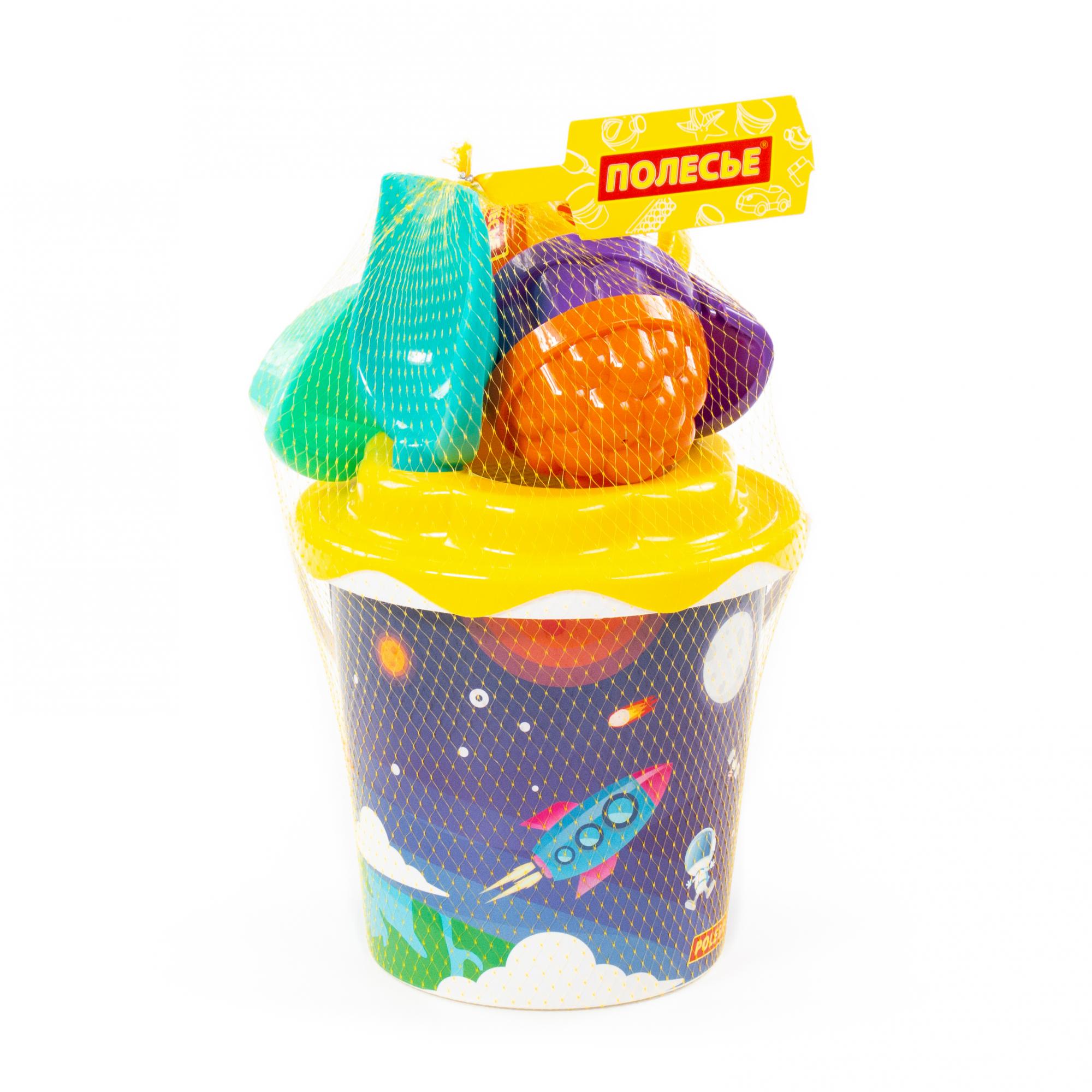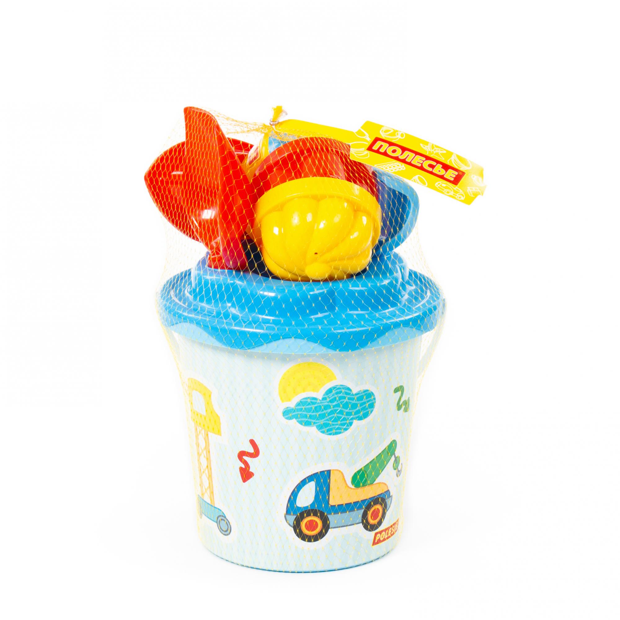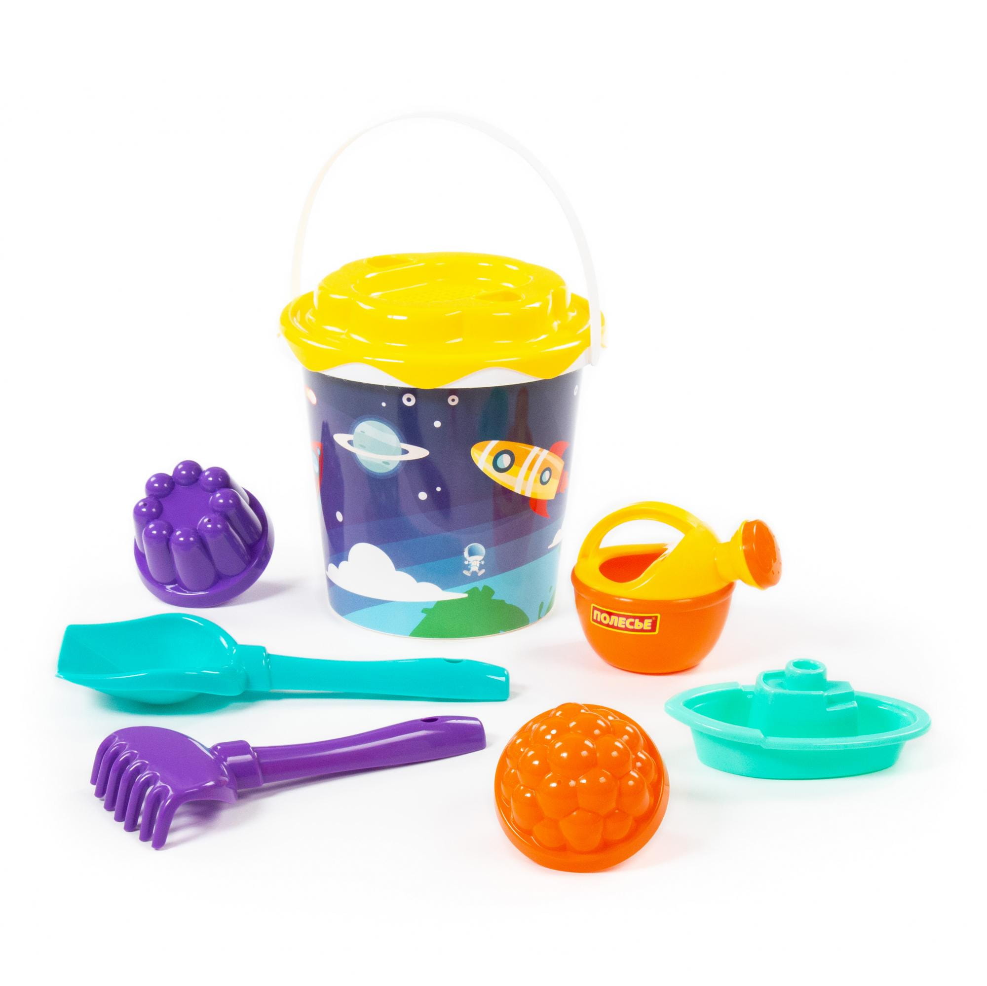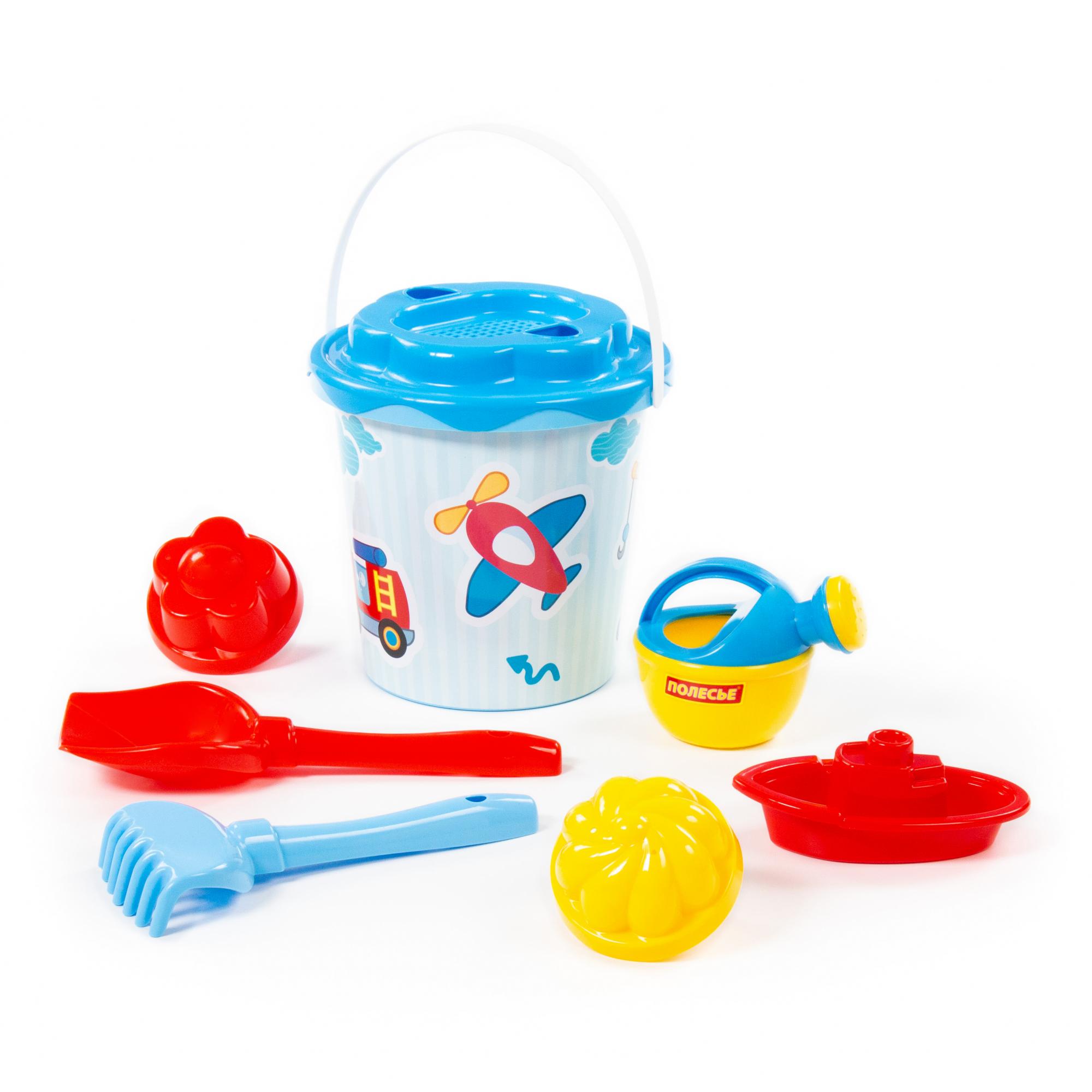 Solidny zestaw do piasku wiaderko + łopatka + grabki + sitko + konewka + statek + foremki 9225