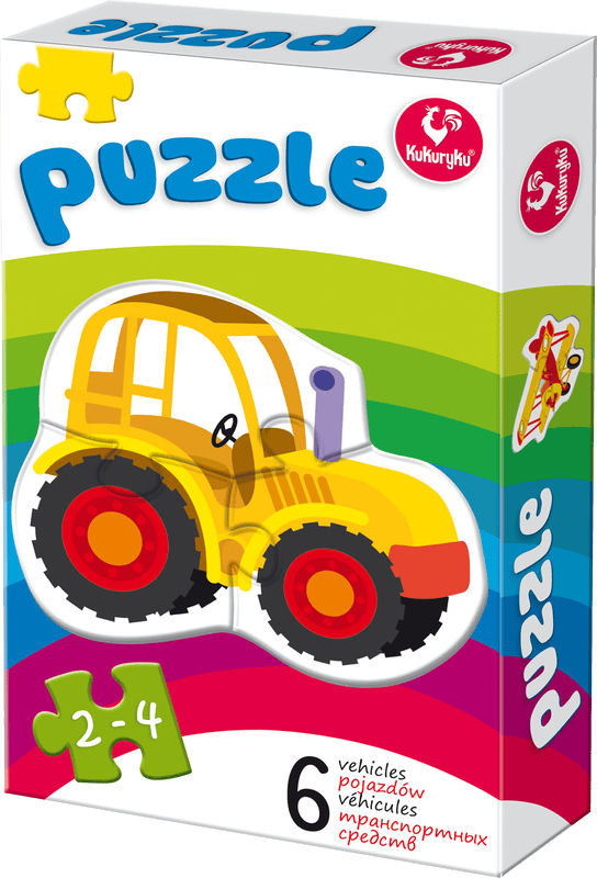 Elementy puzzli z pojazdami Kukuryku wykonano z grubej tektury.