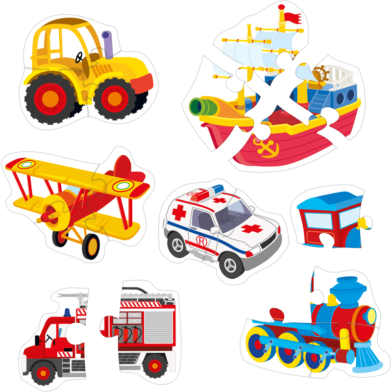 Wzory układanki: traktor, straż pożarna, karetka, statek, lokomotywa i samolot.
