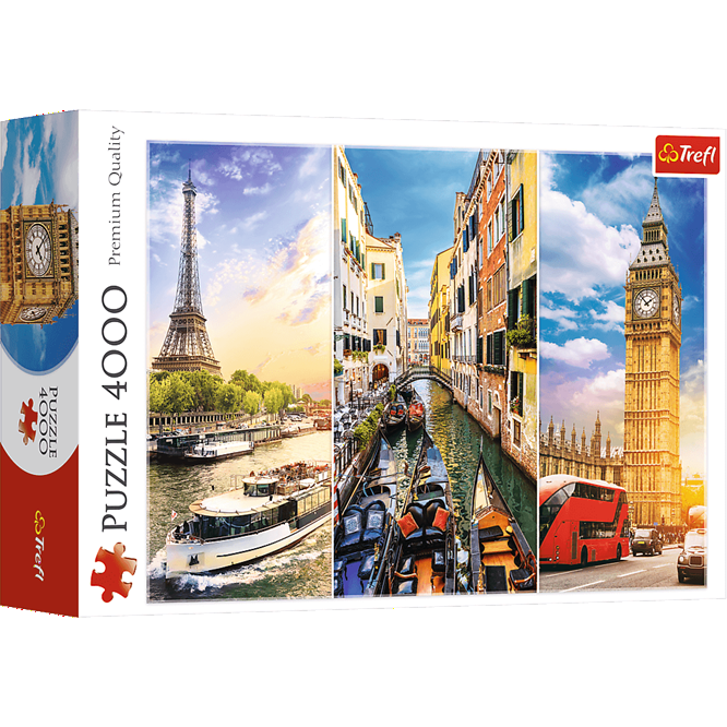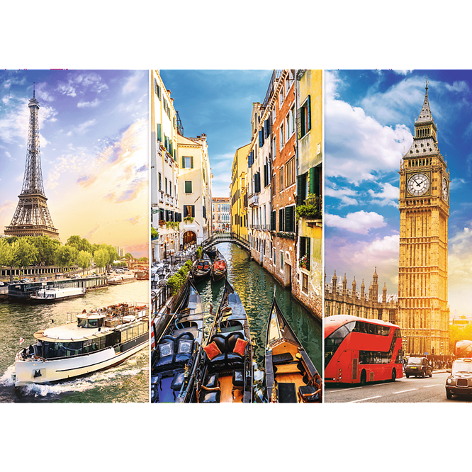 Marzysz o wielkiej wyprawie po najpiękniejszych zakątkach Starego Kontynentu? Puzzle 4000 elementów Wycieczka po Europie to fascynujący kolaż widoków z trzech europejskich pereł: Paryża, Wenecji oraz Londynu. Każdy fragment układanki przybliża Cię do odkrycia klimatycznych uliczek, znanych zabytków i niepowtarzalnej atmosfery tych miast.