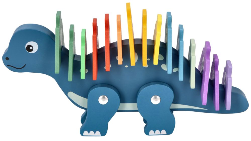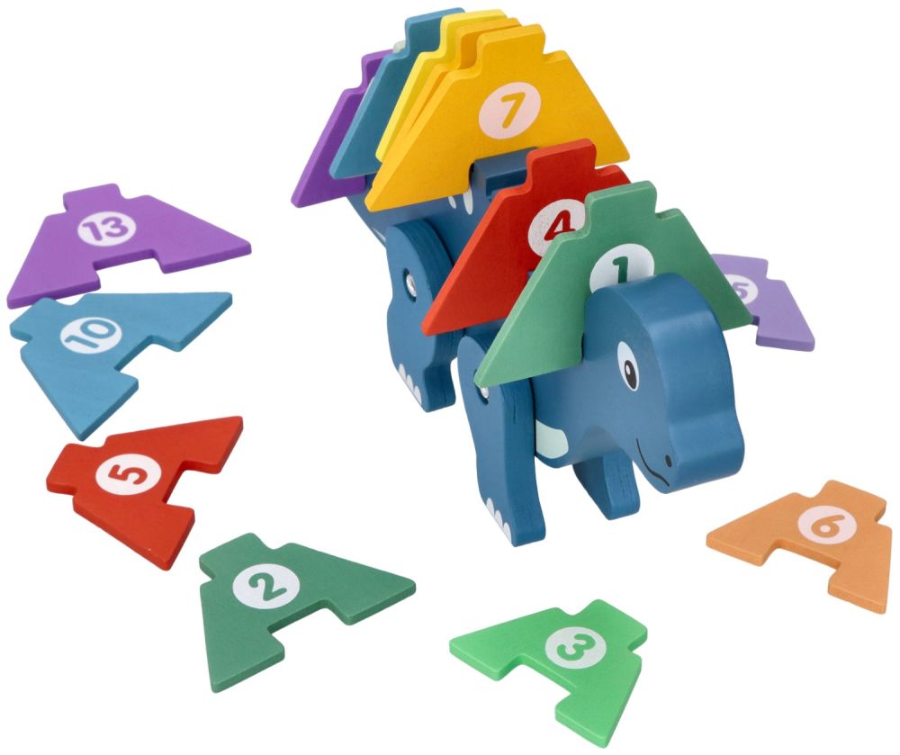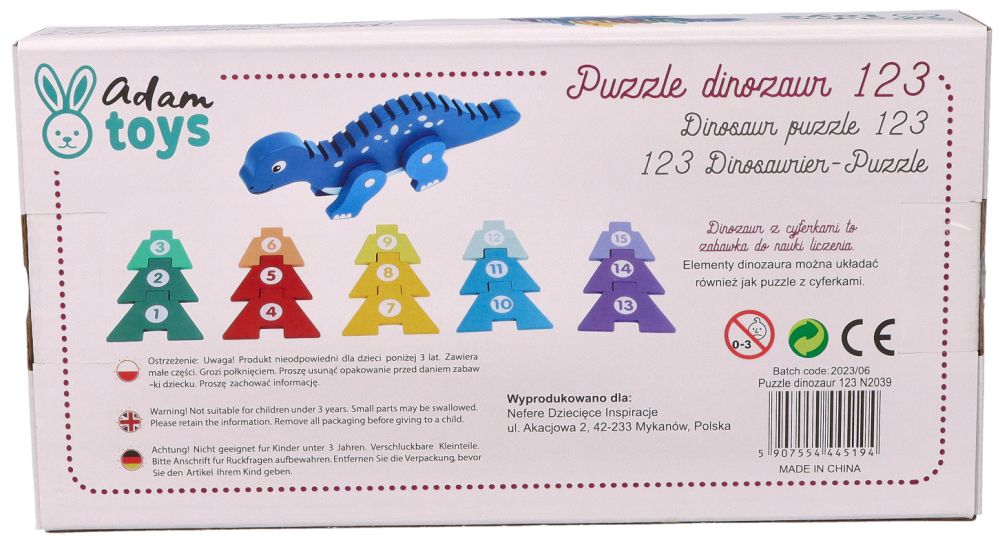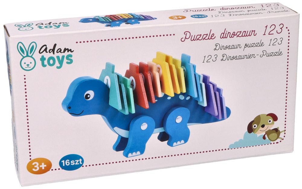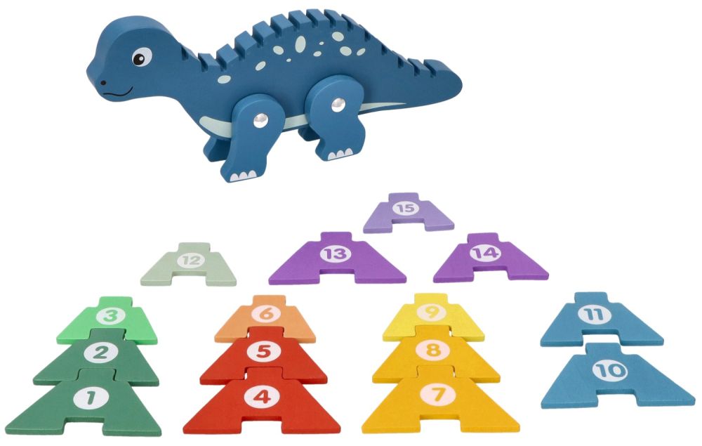 Produkt dedykowany jest dla dzieci od 3 lat i przeznaczony dla jednego dziecka do samodzielnej pracy, choć z pewnością będzie wspaniałą okazją do wspólnej nauki z rodzicami. Cały zestaw składa się z 16 elementów: drewnianej figurki dinozaura oraz 15 kolorowych puzzle-cyfr z numerami od 1 do 15. Elementy w kształcie ostrych kolców grzbietowych można układać na grzbiecie dinozaura, co nie tylko bawi, ale i uczy porządku i ułatwia przechowywanie.