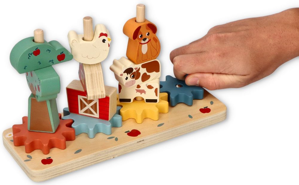 Układanka drewniana ze zwierzętami z farmy do kręcenia zawiera: