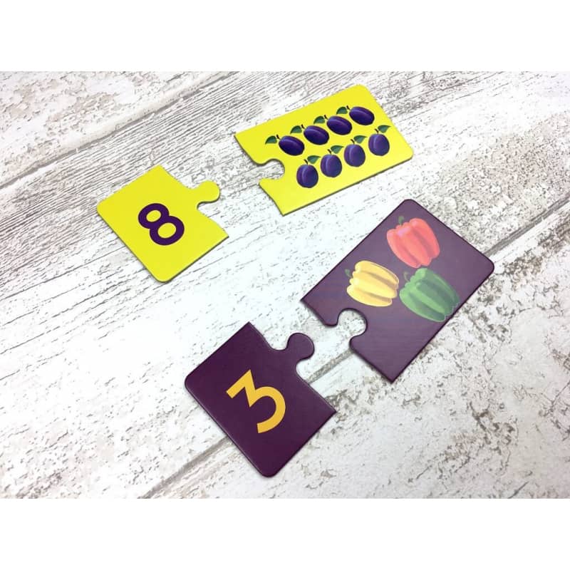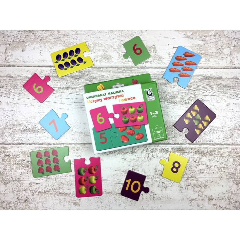 W zestawie 10 par puzzli (20 elementów), które wspierają podstawy liczenia w zakresie do 10.
