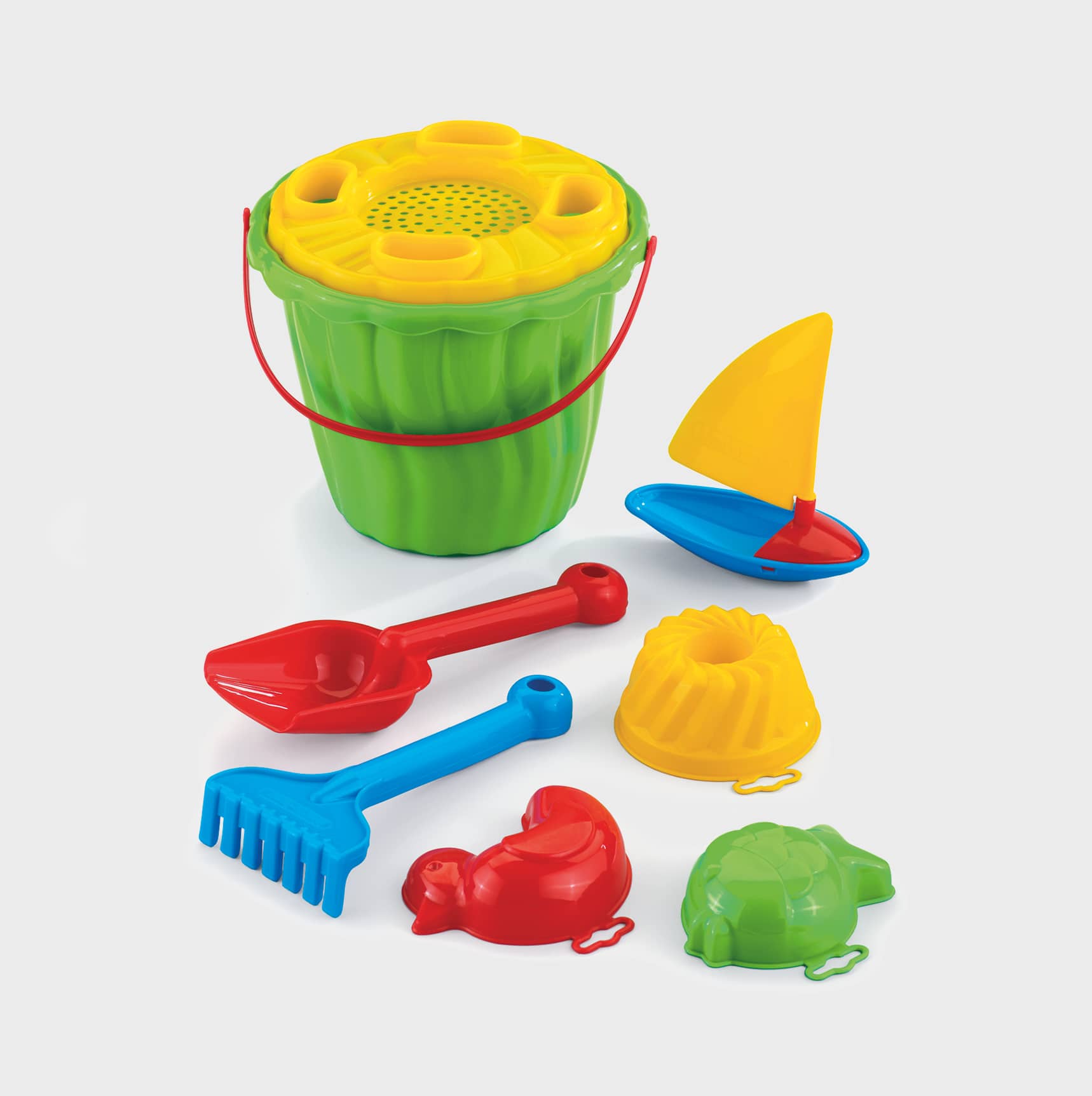 Zawiera wiaderko z sitkiem, łopatkę i grabki, trzy foremki i żaglówkę.